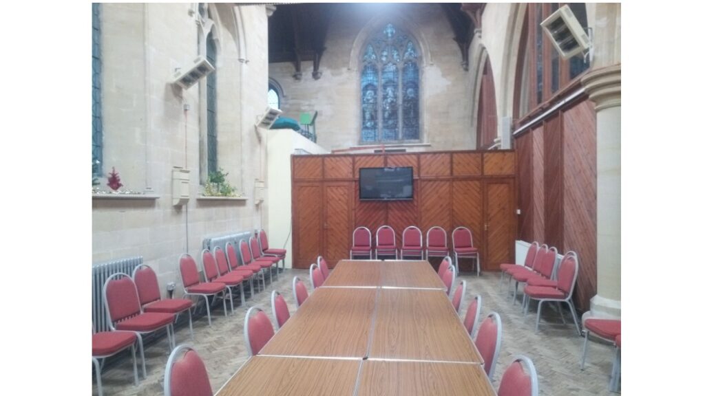 The St Francis Centre. This is a converted North Isle and consists of a well lit heated space for up to about 50 people with ample tables and chairs. There is a kitchen area plus wifi and tv screen facilities. It is well used and booking is essential.